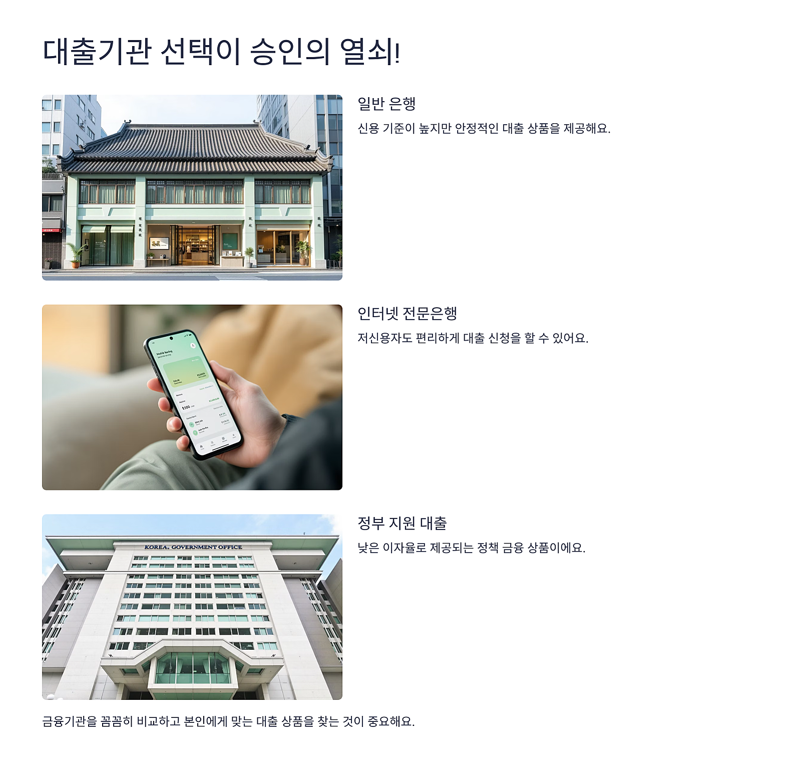 그러다 인터넷 전문은행이나 저신용자소액대출, 정부 지원 대출 상품 같은 옵션을 찾게 됐어요. 특히 인터넷 전문은행은 저신용자도 편리하게 대출 신청을 할 수 있는 다양한 요건을 제공하더라고요. 신용점수가 낮더라도 조건을 맞출 경우 쉽게 승인이 났던 기억이 있어요.