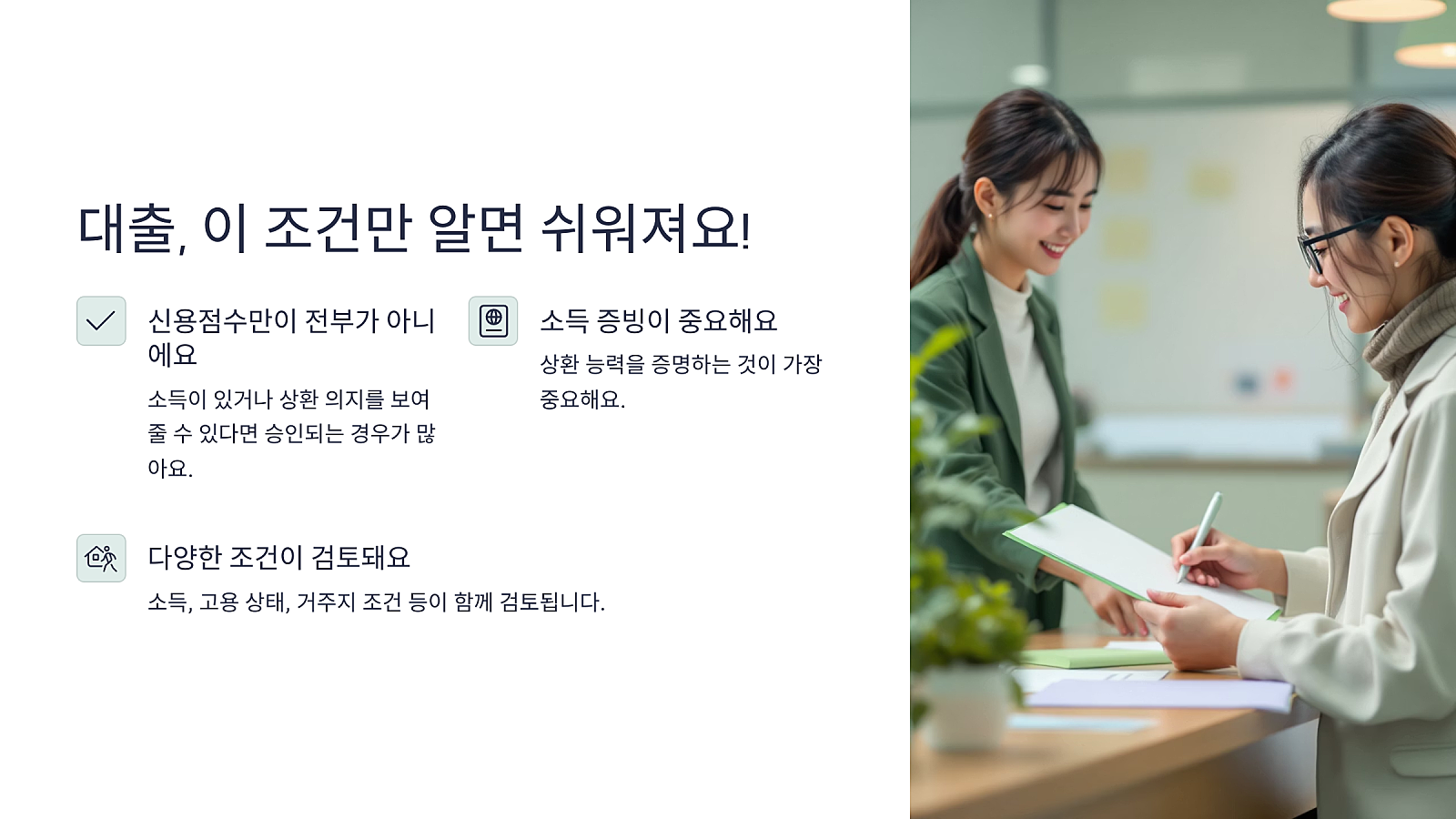 대출 조건은 생각보다 다양했어요. 기본적으로 신용점수가 낮아도 소득이 있거나, 상환 의지를 보여줄 수 있다면 승인되는 경우가 많았죠. 제가 이용했던 금융기관도 소득 증빙만으로 승인해 줬어요.